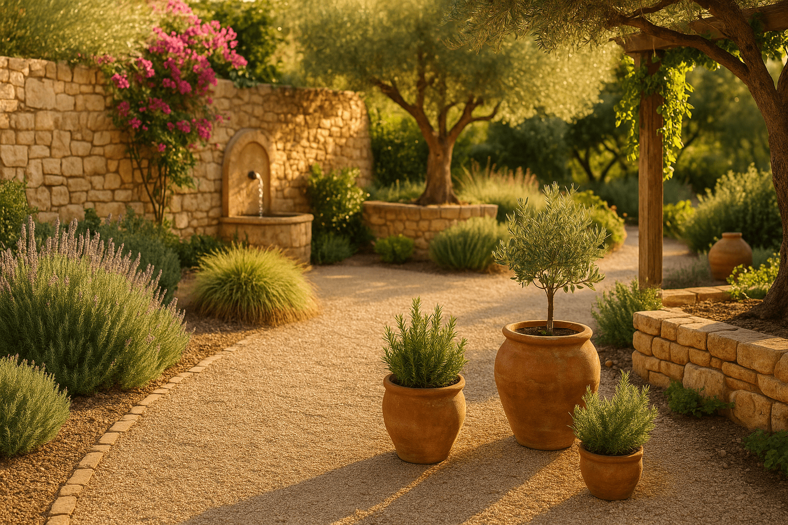 | Plants with Staying Power The planting palette is bold in scent, subtle in colour, and utterly reliable. Fragrant herbs: Lavender, rosemary, thyme, sage, and oregano — all sun-lovers, all easy-care. Architectural showpieces: Olive trees, figs, citrus in large pots, and upright cypress or yew. Splashes of colour: Bougainvillea, pelargoniums, and salvias for vibrant blooms against softer foliage. Groundcovers and accents: Creeping thyme or low grasses to soften edges and fill gaps. These plants aren’t needy. Once established, they thrive on sunshine and occasional watering, making them perfect for a climate-aware garden. |