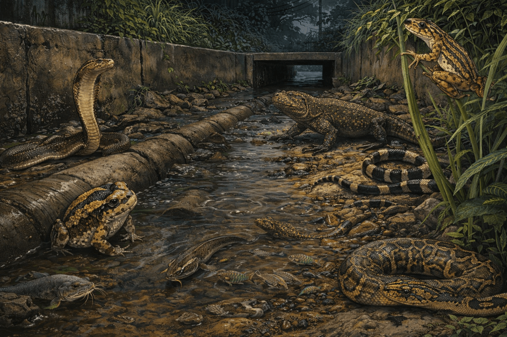 Snakes used the drains as shelter and passage. They were not aggressive, not theatrical, simply present — moving with purpose rather than threat. Some were seen clearly; others were sensed only by stillness or the sudden absence of sound. On occasion, something much larger passed through, its size registering not as fear but as scale—a reminder that the system extended beyond what could be seen at once.