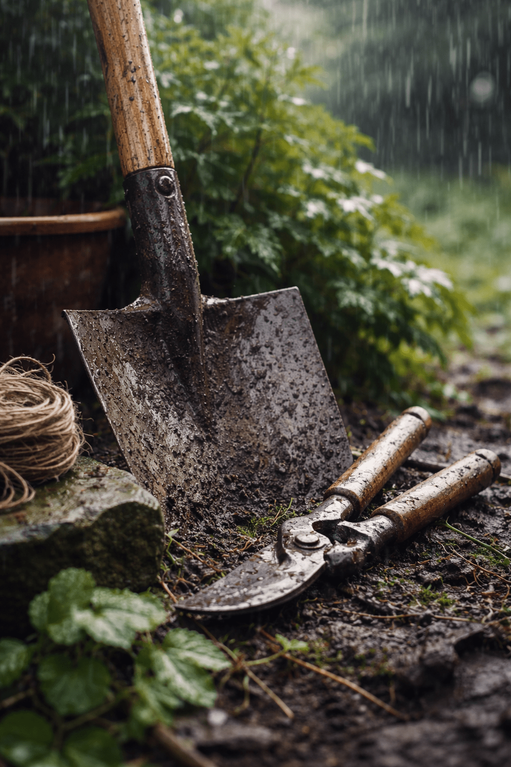An observational essay on working in the garden during rain, exploring how wet weather reveals habits, judgment, and the true nature of maintenance.