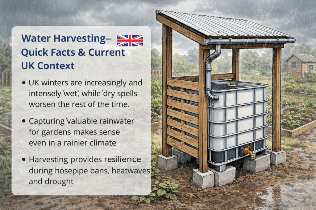 | Water Harvesting — Quick Facts & Current UK Context What Rainwater Harvesting Is Rainwater harvesting means catching rainfall where it lands — usually from roofs or other surfaces — and storing it for later use. In the UK, this typically feeds garden watering, greenhouses, ponds and other non-potable uses rather than the drinking water supply. (Wikipedia) Systems range from small water butts to larger tanks, such as 1000-litre IBC units or underground reservoirs, depending on need and scale. (Wikipedia) Why It Makes Sense (Even in a Wet Climate) The UK is often thought of as uniformly rainy — but rainfall is seasonally uneven, with very wet winters and increasingly dry summers, and both extremes are becoming more frequent due to climate change. (The Guardian) Harvesting captures water during wet phases so it can be used when the land dries out—an efficient strategy for gardens, allotments and community soil hubs. How It Helps Gardens & Shared Spaces Stored rainwater can reduce reliance on the mains supply for irrigation, especially during hosepipe bans. (Countryfile) At allotments and hubs, community harvesting systems, such as shared IBC tanks, can provide visible, equitably accessible supply points for all growers. Using rainwater for plants supports soil biology and plant health without the temperature and chemical differences of mains water. UK Water Realities (Recent News) The Guardian UKGBC Water Magazine Countryfile The Guardian GOV.UK Here’s what’s been in the news: Intense UK rainfall and flooding: Storm systems like Storm Chandra have brought record wet conditions and flooding, underscoring how extreme precipitation events are increasing — with impacts on wildlife and soil systems alike. (The Guardian) Drought is still relevant: Despite wet spells, UK regions continue to experience below-normal river flows and drought indicators, meaning water availability remains stressed. (Water Magazine) Drought planning and warnings: Government drought groups have met to discuss national water shortfalls and response strategies, reflecting both dry periods and the need for long-term resilience.(GOV.UK) Gardening guidance includes rainwater harvesting: Practical advice for gardeners in mainstream outlets now lists rainwater harvesting as a key water-efficiency approach alongside species selection and watering timing. (Countryfile) Longer-term pressures on water supply: Reports note that water shortages — historically associated with southern summers — are part of larger structural concerns about water availability in England. (UKGBC) Public discussion on water scarcity: Debates about UK water stress, conservation, and public behaviour have entered mainstream news, challenging assumptions that a wet climate alone secures supply. (The Guardian) Practical Benefits for Community Growing Reduces mains pressure: Captured rainwater eases demand on mains systems, particularly in the peak growing season. Buffers climate variability: By storing rainfall from winter and rainy spells, shared systems help gardens through intermittent dry periods. Encourages efficient use: Visible storage makes people more aware of water as a resource — not an unlimited one. Things to Keep in Mind Harvesting complements but doesn’t replace mains water — especially for drinking, hygiene, or full plot irrigation in dry spells. Storage capacity and catchment area limit how much water can be held; design must match your soil hub’s needs. UK rainfall patterns are shifting: wetter winters don’t automatically alleviate summer water stress, so buffering with storage still matters. |