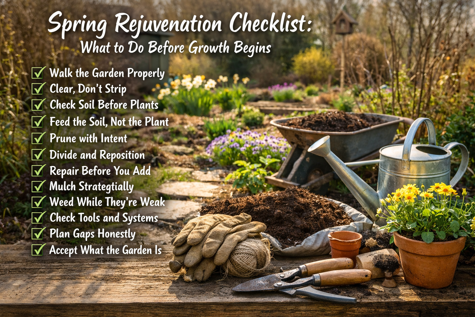 A practical spring rejuvenation checklist covering soil, pruning, mulching, and preparation before growth begins, helping gardens start the season healthy, balanced, and resilient.